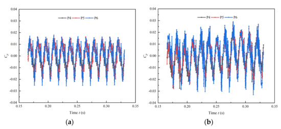 Time domain of pressure pulsation at impeller inlet (Q = Qd): (a) shaft front positioned tubular pump device; (b) shaft rear positioned tubular pump device.