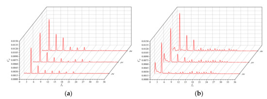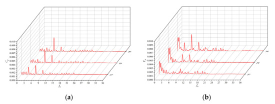 Frequency domain of pressure pulsation at guide vane outlet (Q = Qd): (a) shaft front positioned tubular pump device; (b) shaft rear positioned tubular pump device.