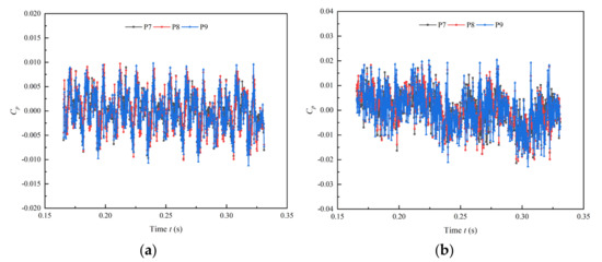 The complex flow inside the axial flow pump will cause pressure pulsation. It is easy to cause vibration, noise and reduce the efficiency and service life of the pump device. With the increase of the calculation cycle, the flow field tends to be stable, so the pressure date of the last four cycles were taken for analysis. The monitoring points P1–P3 are set at the impeller inlet from the hub to the shroud, P4–P6 are set at the impeller outlet from the hub to the shroud, P7–P9 are set at the guide vane outlet from the hub to the shroud.