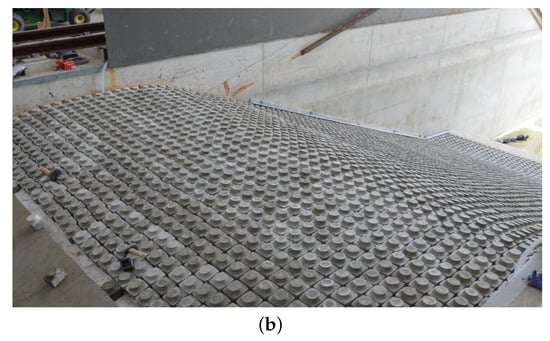 The measurements of the physical wave overtopping tests by Van Steeg [] are used to set-up, calibrate, and evaluate the numerical model for a range of wave load conditions. After the evaluation, the hydraulic loads on the blocks were determined using the numerical model to determine the block revetment specifications leading to the smallest hydraulic forces. This section gives a description of the model set-up (Section 3.1), model calibration (Section 3.2), model evaluation (Section 3.3), and hydraulic loads on the blocks (Section 3.4).