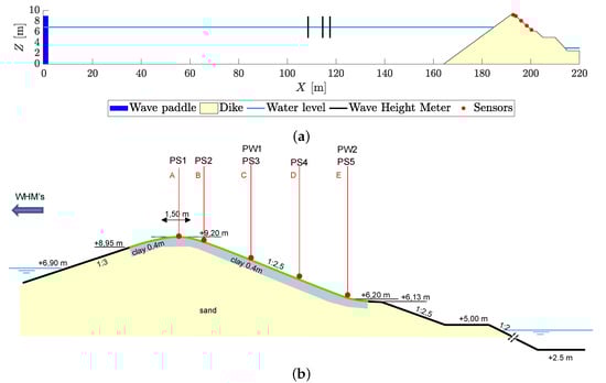 (a) Overview of test setup with wave paddle located at m, water level m and wave height meters located at and m. (b) Cross section of the test set-up in the Deltares Delta Flume, including Wave Height Meter (WHM), Pressure Sensor (PS), and Paddle Wheel (PW), adapted from Van Steeg [].
