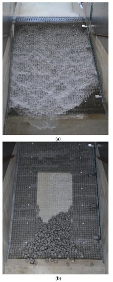 (a) Wave overtopping during Test A []. (b) Damage on Grassblocks after Test B [].