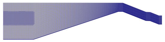 According to Jacobsen et al. [] and Pedersen et al. [], maintaining an aspect ratio of throughout the computational domain improves the accuracy and numerical stability of the model. The mesh size is 30 × 30 cm, leading to 40 cells in the vertical direction. The mesh size on the crest and landward slope is 7 × 7 cm. Similar to the research by Chen et al. [], a wall function was used in the boundary layer near the bottom surface of the flume. The mesh was refined near the bottom along the entire domain using 10 cells with a height of 1 cm to simulate the vertical velocity profile accurately.