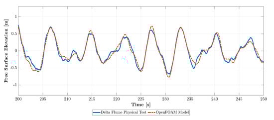 The calibration of the free surface elevation was based on the significant wave height and spectral wave period. The OpenFOAM® model shows great performance for modelling the free surface elevation with an inaccuracy of m for both tests. The spectral wave period was accurately modelled, only with a slight overestimation of s for Test B (Table 4). Figure 7 shows the comparison of the measured and modelled incoming propagation of the free surface elevation on the location of the first wave gauge ( m) between 200 and 250 s of Test B. This signal shows that wave heights were accurately simulated.