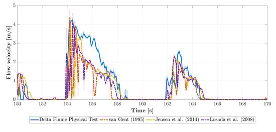 The measured flow velocity at PW1 between – s in Test B together with the modelled flow velocity using resistance coefficients of Van Gent [], Jensen et al. [], Losada et al. [].