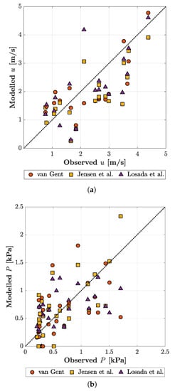 (a) Modelled against observed peak flow velocity u [m/s] per overtopping wave during –350 s in Test B using and . (b) Modelled against observed peak pressure P [kPa] per overtopping wave during –350 s in Test B using and .