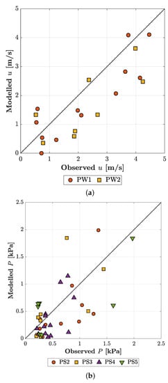 (a) Modelled against observed peak flow velocity u [m/s] at PW1 and PW2 per overtopping wave during –170 s in Test B. (b) Modelled against observed peak pressure P [kPa] at PS2–PS5 per overtopping wave during –170 s in Test B.