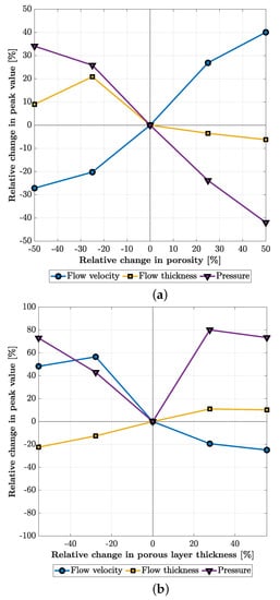 (a) Relative change in porosity n [%] compared to the default . The peak values are based on the time series between 290 and 310 s and compared to the default peak values using . (b) Relative change in porous layer thickness [%] compared to the default mm. The peak values are based on the time series between 290 and 310 s compared to the default peak values using mm.
