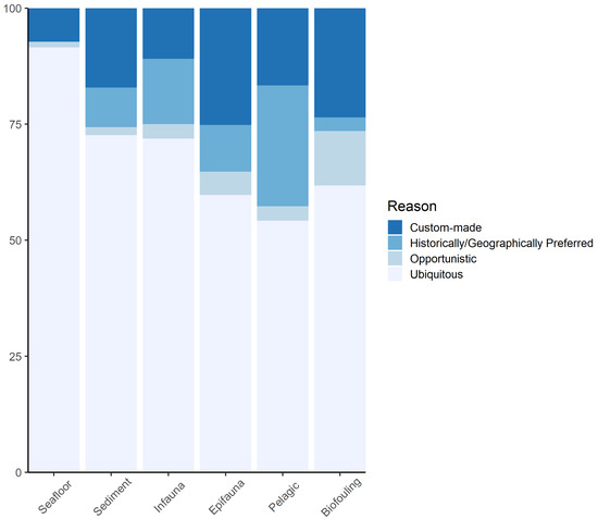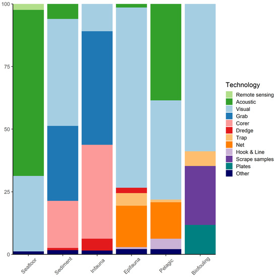 Few reviewed documents explicitly stated the authors’ reasons for choosing a specific technology over other available options, but we could often assess the motives from the characteristics of the technologies, or the description of the methodologies employed (Figure 3). Over 50% of the time, the technology was ubiquitous enough to handle the specificities of the sites monitored in the reviewed studies (e.g., MBESs, ROVs). The preference for ubiquitous technologies even reached 90% of the studies that surveyed seafloor characteristics. About 30% of the studies looking at pelagic communities used historically and/or geographically preferred technologies. These were mainly various types of nets and trawls that have been used for decades (often centuries) for targeting particular species and/or environments (e.g., beach seine for sampling from shore). In roughly 25% of the studies assessing changes in epifauna and biofouling communities, and 20% of the documents describing sediment or pelagic habitats, the technologies employed were custom-made. Often, these were drop or towed cameras and the frame and suite of sensors were specifically assembled by the teams conducting the surveys, or pots and traps were modified to target and keep all sizes of specific species. Lastly, opportunistic uses of a technology were less common, except for monitoring biofouling communities, and frequently corresponded to underwater video footage acquired during routine maintenance activities around oil and gas installations, pipelines, or cables, and provided to researchers for their studies (e.g., [42,43,44]). Observers on commercial or recreational fishing boats were also classified as opportunistic.