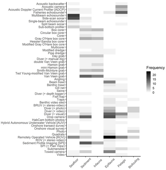 Paired with the abundant diversity of technologies identified in this review, a great variety of analyses and software was used to extract, process, and analyze the data after sampling (Table 4). Some of the software used were proprietary to specific instruments, but the most common ones were PRIMER (75 entries) and R (28 entries). Several studies used the biotic and abiotic data to generate habitat classifications such as the Coastal and Marine Ecological Classification Standard (CMECS; e.g., in [54] or [55]) or the JNCC’s Marine Habitat Classification for Britain and Ireland ([56]; e.g., in [57] or [58]). However, the most common analyses were univariate (e.g., ANOVA) or multivariate statistical analyses (e.g., (n)MDS, PCA, PERMANOVA, SIMPER) aimed at calculating and comparing biodiversity indices, characterizing faunal assemblages or sediment classes, or modeling the distribution of animals related to abiotic parameters (Table 4).