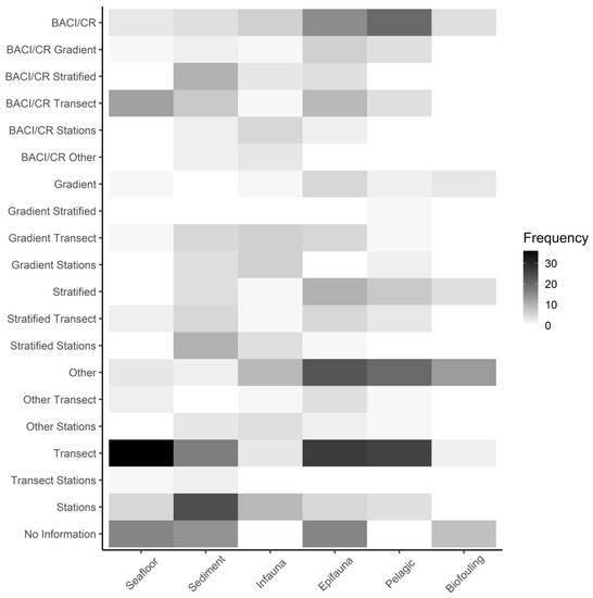 The options for categorizing sampling designs were based on the most common designs used in marine ecology [18,19,21]. Before after control impact (BACI) and control/response (CR) refer to sampling designs that look at highlighting differences between impact and reference sites on a temporal and/or spatial scale. A gradient design usually refers to increasing distance or depth from an impact site. Stratification is a design where sampling locations are distributed throughout the diversity of habitats and/or depth previously known in the study area. Several studies did not use these well-defined sampling designs; instead, they followed transects to canvas an area, collected unclassified stations (i.e., not impact or control sites) randomly or on a predefined grid, or any other design that could not easily be classified. Often, two or more sampling designs were used in conjunction (e.g., stratification with transects, before/after gradient with stations).