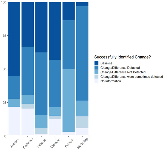 Several of the documents reviewed for this study focused on characterizing baseline habitats before any project (e.g., marine energy or offshore wind developments) would start, sometimes highlighting differences in habitats. Others focused on detecting whether changes and/or differences in habitats and communities were observed after an event or as distance increases from a point of impact (e.g., artificial structure, dredge material dump site). “No information” was used for studies that did not provide details about whether they looked at detecting changes or differences in habitats. Here, too, two or more group options were sometimes applicable at the same time (e.g., a baseline study that identified different communities of mobile epifauna but no difference in sessile epifauna).