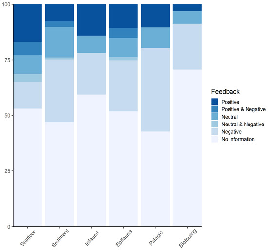 While about half of the studies did not provide feedback on the sampling technologies they used, those that did varied between fully positive, fully negative, neutral, and a mix of each (Figure 6). The greatest proportion of positive feedback was for technologies used to survey seafloor characteristics such as MBESs and side-scan sonars, as well as infauna communities (no dominant technology). Examples of feedback include: “Multi-frequency side-scan sonar and the introduction of color to the processed imagery has improved classification of the seabed as compared with single frequency data” [45]; and “The Hamon grab provided point-sample information on fauna and sediment composition. These data allowed a quantitative analysis over the different areas and, to a degree, identified changes occurring within and in the near vicinity of the disposal site between 2002–2004” [17]. On the other hand, the greatest proportion of negative feedback was for technologies used to survey sediment characteristics such as SPI and Van Veen grabs, and pelagic communities such as divers (equipped or not with imagery tools) and ROVs. Examples of feedback include: “Different sediments result in different degrees of penetration” [46]; “13 photos were invalidated due to the seabed surface being invisible as the prism had protruded too deep” [47]; “Fish behavior may be affected by the presence of divers” [48]; and “Real-time positioning is a major challenge for micro-ROVs (can be added for a substantial cost)” [49]. Often, the feedback was relative to a specific use for a particular goal (e.g., ROV tether too short to cover the entire survey area when deploying from a drilling platform [50]), but sometimes it was more general such as sled and towed cameras are particularly sensitive to the rocking motion of swell at the surface (e.g., [51,52]), depth is a limit for sampling with scuba divers (e.g., [53]), or corers and grabs do not perform well in coarse sediments (e.g., [12]).