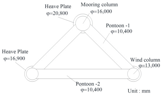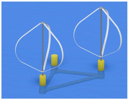 This study focusses on an FOWT concept with two Darrieus-type wind turbines, which is one of the types of vertical-axis wind turbine (see Figure 1). The concept is termed double-rotor VAWTs. The use of a VAWT results in a lower center of gravity, eliminating the problem of the high center of gravity of a HAWT. In addition, the yaw control mechanism, which has a high failure rate in HAWTs, is not required, thus reducing maintenance costs. The concept of multiple VAWTs on one floating structure was developed by M. Collu et al. [6] for a doughnut-shaped floating structure. In addition, Parneix et al. [7] were developing an FOWT with two straight wing VAWTs. In this study, an isosceles triangle is used for robustness and mooring purposes. A single point mooring system (SPM) is used for mooring. An SPM is usually used in FPSO (Floating Production, Storage and Offloading system) and FSO (Floating Storage and Offloading system), but it has already been shown in [8,9] to be useful in FOWTs. By combining a VAWT that is omnidirectional to the wind with an SPM that can turn around its mooring, the VAWT can always follow the wind without the need for yaw control. In this model, it has already been shown in tank experiments that turning motion around the SPM is possible [10]. Thus, the use of two VAWTs on one floating structure is expected to reduce mooring costs and the occupied area.