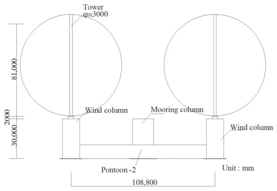 The actual double-rotor VAWT proposed in this study is shown in Figure 8 and Figure 9. The floating wind turbine in this study has a simple structure that emphasizes robustness and a mechanism that allows it to follow the wind around its mooring point and rotate in accordance with the wind. The distance between two vertical-axis wind turbines has been shown to have the highest power generation efficiency when the distance between the two turbines is 1.36 times the rotor diameter. Therefore, in this study, the distance between the turbines in this study was set to 108 m [16].