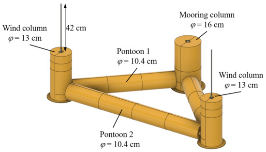 In the towing tank test of this study, it is necessary to measure the strain of the floating body. Therefore, an elastic model scaled down to 1/100 of the actual model was fabricated. Figure 10 shows the elastic model, Table 4 shows the scale factor, and Table 5 shows the floating body parameters. Where V is the drainage volume, I is the waterline cross-sectional second moment, is the metacenter height, is the natural period of heave, and is the natural period of pitch. As shown in Figure 10, the tower height of this test model is 42 cm, with a ducted fan mounted at the top. Approximately 95% of the load generated in a vertical-axis wind turbine occurs in the central 60% [17]. Therefore, in this study, thrust was simulated to occur as a concentrated load at the center of the vertical-shaft wind turbine.