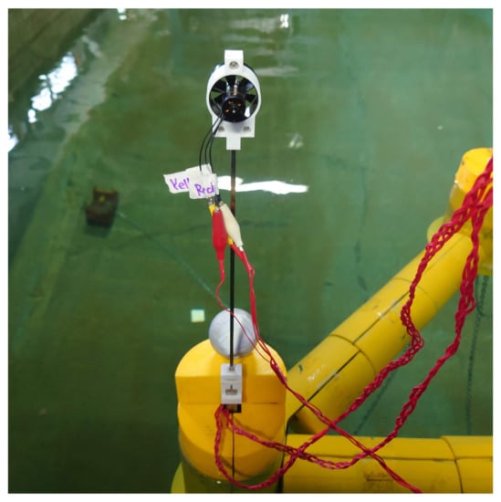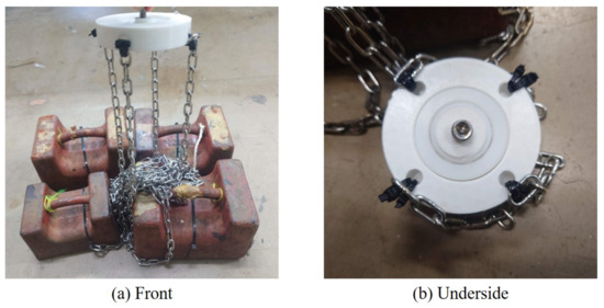 The mooring mechanism used in this experiment is shown in Figure 17 and a summary of the mooring chains is shown in Table 7. In the experiment, an anchor was placed 1.2 m away from the floating structure, and four catenary moorings were used. The mooring cables were screwed to the lowest part of the mooring stainless core, and a bearing was used to simulate a single point mooring.