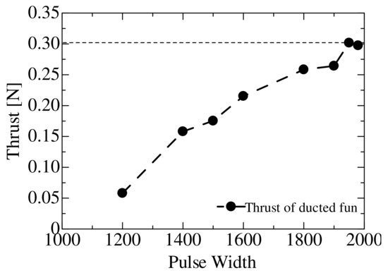 In the tank test of this study, the wind load is simulated by generating thrust by a ducted fan instead of installing a wind turbine rotor (see Figure 12). The thrust of the 1/100 scale model is 0.30 N. To control the ducted fan used, the thrust was investigated. Figure 13 shows the thrust test and Figure 14 shows the test results. The ducted fan was controlled by varying the pulse width and adjusting the speed. As a result, a thrust of 0.30 N was obtained when the pulse width was set to 1950.
