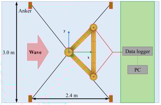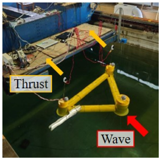 A schematic diagram of the experiment is shown in Figure 15, and the actual model is shown in Figure 16. The specifications of this test tank are 70.0 m long, 3.0 m wide, and 1.6 m deep, and it has a wave generator.