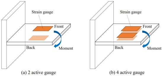 In this study, bending strain of stainless cores was measured by strain gauges and converted to bending moments. Figure 19 shows the method of measuring bending strain. Typical methods for measuring bending strain using strain gauges are the two active gauge method and the four active gauge method. The method using two or four strain gauges is used to remove strain components other than those to be measured. In this study, it is necessary to remove the tensile and compressive components in order to measure only the bending strain. The major differences between the two active gauge method and the four active gauge method are output values and temperature compensation. For the output value, the output is twice the actual strain when two strain gauges are used, and four times the actual strain when four strain gauges are used. Therefore, the choice should be made according to the performance of the transducer used in the experiment. Regarding temperature compensation, changes in temperature from the installation position to the bridge circuit may affect the results of strain gauges. The four active gauge method is less affected by temperature than the two active gauge method.