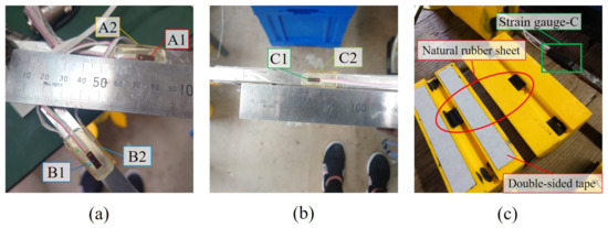In this study, waterproof three-wire strain gauges were used to measure bending strain using the two active gauge method. Figure 20 shows the strain gauges used and Table 8 shows the strain gauge characteristics.