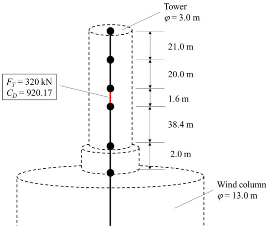 In this study, UTWind code and rotor thrust obtained from QBlade were combined for the numerical simulations. UTWind is a numerical simulation code developed by the University of Tokyo for coupled FOWT analysis. This code has been improved and the latest version, called “NK-UTWind”, has proven to be useful enough for the coupled analysis of FOWT with a HAWT [20,21,22]. In this study, we used a prototype of this code [23] and attempted to improve it to be compatible with VAWT. The floating structure in this study is assumed to be a framework structure. UTWind is a weakly coupled wind turbine-floating body elastic response analysis based on FEM. The fluid forces are based on the Morrison equation for the floating body and the blade elementary momentum theory for the rotor part of the wind turbine. Then, the equations of motion are substituted into the equations of motion together with the external force vector derived from the calculated fluid force, and the equations of motion are solved in the time domain to obtain the time history displacements and stresses.