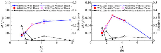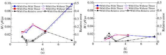 Figure 39 shows the bending moment occurring near the center of Pontoon2. The experimental bending moment at this location is much lower than UTWind in both the vertical and horizontal directions. This may be due to the fact that the bending stiffness at this point may have changed during model fabrication. The core stainless steel of Pontoon2 was made by joining two stainless steel square bars using I-shaped metal fittings and metallic glue. Strain gauges were glued at a distance of 60 mm from the joint, and the same positions were output and plotted in the graph for UTWind. As a result, the experimental bending moments were generally lower than those of UTWind, but similar trends were obtained. Therefore, it can be inferred that the bending moments in the experiment also occur as shown in UTWind. From Figure 37, Figure 38 and Figure 39, we can evaluate the effect of thrust on the bending moment from the experimental results, focusing on the relative error, and find that it has more effect on Pontoon2 than on Pontoon1. Furthermore, the effect is more pronounced for shorter wave periods.