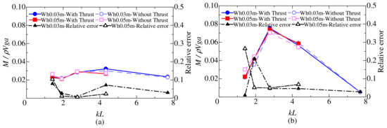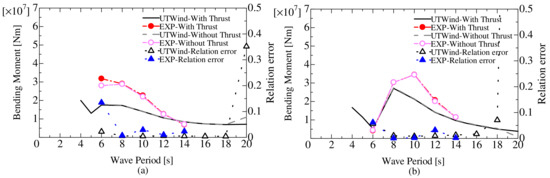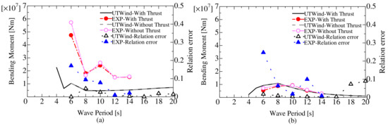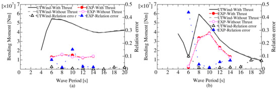 Figure 37 shows the bending moment at the junction of Pontoon1 and the wind column, where Figure 37a is bending moment around the y-axis and Figure 37b is bending moment around the z-axis. Figure 37a shows that bending moments around the y-axis for wave periods below 12.0 s are higher than UTWind’s and are almost the same for wave periods of 14 s. Figure 37b shows that the bending moment of UTWind has a maximum value of 2.70 × 107 Nm at a wave period of 8.0 s, while the experimental bending moment has a maximum value of 3.45 × 107 at a wave period of 10.0 s. This feature is the same as the surge displacement shown in Figure 34, indicating that bending moment around the z-axis acting at the junction point of Pontoon1 and the wind turbine float is affected by the surge displacement. The relative error between the bending moment when thrust occurs and when it stops, with the bending moment in the absence of thrust as the reference, is less than 5% for both the experimental results and UTWind in the wave period range of 8.0∼14.0 s, indicating that the effect of thrust is negligible. In other words, the effect of thrust on the bending moment generated at the junction point between Pontoon1 and the floating body of the wind turbine is small.