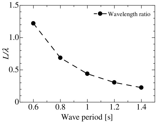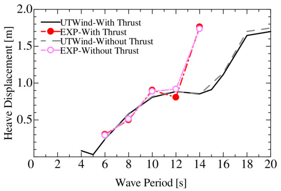 Figure 36 shows the experimental results and UTWind’s pitch angle at a wave height of 0.04 m. Surge and heave displacements shown in Figure 34 and Figure 35 show similar trends between the experimental results and UTWind. However, the pitch angle did not show a similar trend between UTWind and the experimental results. The experimental results were lower than the UTWind results when the wave period was 12.0 s or less, and when the wave period was 14.0 s, the UTWind result was 0.12 deg, while the experimental result was 0.78 deg, showing a large discrepancy between the two. One possible factor is the influence of the strain gauge chord. In this experiment, the chords of the strain gauge were bonded to the stainless core of Pontoon1 and Pontoon2, and were connected to the equipment outside the floating structure from the base of the left and right towers. At this time, the chords that were outside the floating structure were submerged in rings placed in the air to prevent them from being affected by floating body motion. However, as shown in Figure 36, the same trend did not appear in the UTWind and experimental results, which may have affected the results to a small extent. The natural period of pitch was designed to be 8.0 s, and UTWind showed a tendency for the pitch angle to be dominant at that wave period. However, we could not infer from the experimental results that the pitch angle tends to be dominant at that wave period.