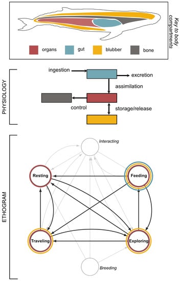 The simplified ecophysiological individual model formulated here combines the growth and the dynamic energy budget of the organism, distinguishing the bones from the storage compartment (i.e., the blubber) and the remainder of the body (see top diagram in Figure 1). The individual dynamics of these three compartments were formulated as a System (systems of equations are indicated by the capital “S” in the remainder of the text):