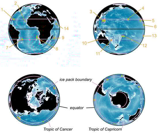 Configuration of the simulated Earth system and positioning of the Distinct Population Segments, numbered from 1 to 14: 1—West Indies, 2—Cabo Verde, 3—Western North Pacific, 4—Hawaii, 5—Mexico, 6—Central America, 7—Brazil, 8—Gabon and Southwest Africa, 9—Southeast Africa and Madagascar, 10—West Australia, 11—East Australia, 12—Oceania, 13—Southeastern Pacific, 14—Arabian Sea. Five parallels structure the space: the equator, the tropical latitudes and the summer limits of the Ice Packs in the Arctic (75° N) and Antarctic (72° S).