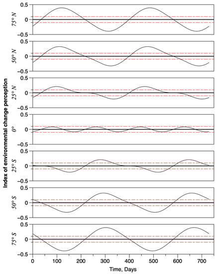 Examples of the spatio-temporal fluctuations of environmental changes as perceived by individuals in the model. The black curves represent the variations of the index of perceived changes. The red dashed lines are the 0.1 and −0.1 thresholds, above and below which environmental change perceptions are significant (positively and negatively, respectively). The black solid line indicates the zero baseline. Seven latitudes are represented, showing the doubling of the oscillation when converging to the equator. In addition, at the equator, there is no significant perception of environmental changes.