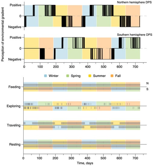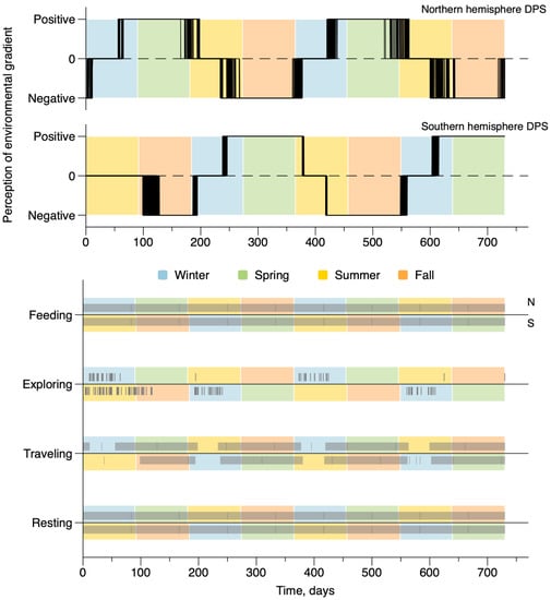 The calculation of the index also shows an inversion of phase between the northern and Southern Hemispheres, accounting for the inversion of the seasons. The perception of the gradient is local and depends on the position of the whale. The resulting activity pattern is characterized by alternating periods of residence in either lower or higher latitudes and periods of migration in between.