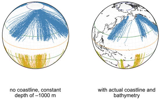 The bathymetric component of the ETOPO1 global relief data (Figure 2) constrained the movements and dynamics of the whales. The proportion of negative height is for the “Ice Sheet” file used in this study, and for the corresponding “Bedrocks” file. The average negative height is m for the “Ice Sheet” file and m for the corresponding “Bedrocks” file. The minimum height is −10,898 m in both cases. The dimensions of the ocean found with the “Ice Sheet” file is km and 368 × 10 km for the “Bedrocks” file. The calculated volume is 1.3328 × 109 km for the “Bedrocks” file and 1.3358 × 10 km for the “Bedrocks” file. The 75° N parallel and 72° S parallels were set as an Ice Pack barrier preventing whales swimming further toward the respective poles. The calculated summer Arctic Ice Pack area with a southern limit at 75° N was equal to km and the Antarctic one with a northern limit at 72° S was equal to km using the “Ice Sheet” data set. These calculated areas were equal to km and km for summer Arctic and Antarctic Ice Packs, respectively, using the “Bedrocks” data set.