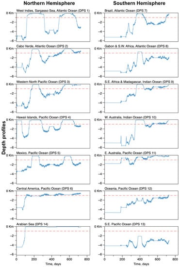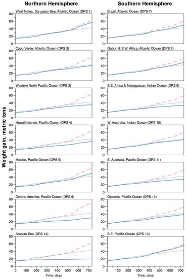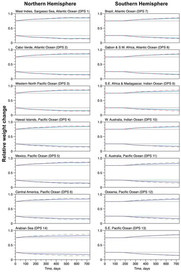 When simulations had a uniform ocean basin depth and no coastlines, the differences between individuals were small, only driven by the starting position in the DPS locations distributed around the tropics. These differences tended to decrease because of strong dispersion of individuals in this configuration. In all cases using the uniform ocean basin, the model over-estimated the total weight growth, compared to a nominal isometric growth curve. The over-estimation mainly concerned the growth of the organ compartment that consumes energy for the functioning of the organism. This means the compartment has exceeded its mass and energy requirements. In contrast, when the actual Earth topography is used, the simulated weight increase curves are much closer to the nominal weight []. The difference is attributed to the effort made to avoid obstacles when individuals were in shallow waters. Individuals whose growth remained over-estimated were located in DPSs that permitted substantial travel in deep areas of the ocean (West Indies (DPS 1) and Southern Pacific (DPS 13) mainly).