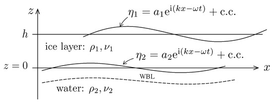 In this study, we re-consider the problem of linear waves in a two-layer fluid system of a viscous ice layer overlaying viscous water. Our interest is in the distributions of fluid velocities in both the ice layer and wave boundary layer in the water just underneath the ice. With an ice-agglomeration cover, the wave boundary layer at the ice–water interface is expected to be enhanced due to the eddy activities resulting from broken ice interacting with the wave [5,7]. In a recent small-scale lab study, Rabault et al. [14] reported eddy structures from PIV (particle image velocimetry) measurements, attributing their origin to the generation, and subsequent diffusion of strong vortices by the drifting and colliding of packs of grease ice. On the other hand, the water velocities and their shear rates in the boundary layer affect the ice-layer flow above, because of the conditions of stresses and velocities at the ice–water interface. Naturally, questions may be asked: How do the ice-layer viscosity and thickness affect the boundary layer water flow just underneath the ice? How do the eddies and shear-induced mixing in the wave boundary layer, as indicated by the water eddy viscosity, affect the velocity distribution in the ice layer? Furthermore, the effects of viscosities alter the phase relation between the waves on the upper surface and at the interface and, consequently, the phase relation between the fluid velocities. This is the manifestation of waves becoming rotational. However, the physical importance is that the horizontal and vertical velocities of the linear flow are now correlated, producing a Reynolds stress that represents the mean momentum flux due to the linear wave fluctuations. This is the driving force for wave-induced Eulerian steady streaming, which, when combined with the Stokes drift, gives the Lagrangian transport of particles [15,16]. What are the vertical profiles of the wave-induced Reynolds stress in the ice layer and the water underneath it? How are they affected by the ice and water viscosities? With a goal of obtaining the drift velocity under the ice, Weber [5] formulated a nonlinear analysis using a Lagrangian formulation. To ease the mathematical complexity, Weber considered the asymptotic limit when the upper ice layer is so thin and viscous that it is equivalent to an inextensible surface film. While a formal nonlinear analysis can be carried out using the similar method, but treating the ice layer as a viscous fluid, the Reynolds stress (a nonlinear property obtained from the linear flow) can nevertheless provide preliminary insight into the steady streaming.