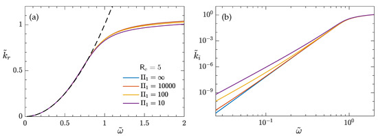 In the simplest case of two layers of inviscid fluids of different densities, the classic Lamb’s [21] solution shows that for each given , there are two modes of oscillations: For a surface mode, the wave on the upper surface has a greater amplitude than that at the interface, and the two waves are in-phase. For an interfacial mode, the greater wave amplitude is at the interface and the two waves are out-of-phase by . For two layers of viscous fluids, Equation (21) still permits two types of oscillations for a given , but the interfacial mode (in the sense that the two waves are nearly out-of-phase and the greater wave amplitude is at the interface) has a complex wavenumber with a very large attenuation rate . Such an interfacial wave cannot propagate far into the ice field, and hence may not be relevant under the real conditions of sea ice and ocean waves. In the discussions below, we therefore focus on the surface mode solutions. The dimensionless dispersion Equation (21) simply reads . Since the density ratio does not change significantly for ice and seawater, we will mainly examine the effects of ice condition and viscosity ratio , taking .