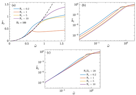 Fixing the viscosity ratio and varying , the – relationship changes significantly, while the attenuation profile follows a similar trend for moderate and low , despite an increasing with a decreasing (Figure 3a,b). For sufficiently high , when the attenuation rate becomes so high that the e-folding decay distance is comparable with the wavelength , the wave behaves more evanescent than propagating. This is where tends to plateau and tends to vary very mildly with . In lab experiments, Rabault et al. [14] used high frequencies ( 1.5–2.7 Hz) and relatively thick grease ice ( cm). Their data clearly show that the wavenumber becomes nearly invariant for Hz, supporting the result of plateauing at high in Figure 2a and Figure 3a. A decrease in could be caused by a greater or smaller h, or the combination of both. Varying h will alter the correspondence between the dimensional and dimensionless frequency. While this is not a mathematical concern, it is convenient to assume a fixed h when interpreting the results in Figure 3a,b, so that all curves have the same -to- correspondence, making the comparison straightforward. In that case, when we vary to change but keep , we imply that varies accordingly with . In other words, the comparison of attenuation profiles in Figure 3b shows the combined effects of increasing both and . Recall that is little affected by (Figure 2a). Noting that , we can examine the effect of alone on by holding constant while varying . This is shown in Figure 3c for . It is seen that the ice viscosity has a stronger, more complex effect on at high frequencies.