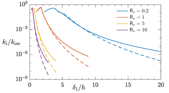 The Reynolds number compares the inertial force to the viscous force in the ice-agglomeration layer [17]. The diffusion of vorticity in the ice layer is characterized by the time scale , whereas the time scale of fluid motion under the gravity wave may be characterized by in view of the thinness of the layer. Thus, , and indicates the flow regime where the time scale of vorticity diffusion is faster than the inertial time scale of wave motion in the ice layer.