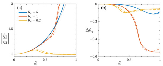 (a) Ratio of wave amplitude at the upper surface to that at the interface, . (b) Phase difference between the waves, . For each , (solid), 100 (dashed). For the case of two inviscid fluids, Lamb’s solution of is the black dotted curve in (a), while the waves are in-phase; i.e., .