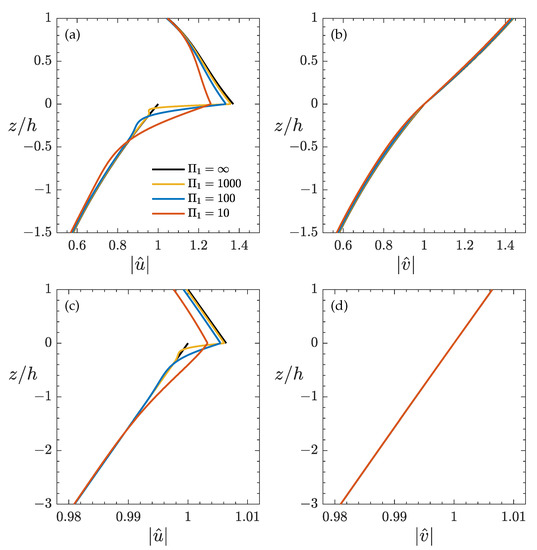 The vertical velocity amplitude is little affected by the ice-layer viscosity or the presence of WBL in water, and closely follows the solution for an irrotational deep-water wave (i.e., ), except for a slight departure occurring in the ice layer when the wave is short (e.g., ); see Figure 7b,d. This is because v directly responds to the oscillations of the upper surface and interface, and, therefore, to the dynamic pressure determined by the irrotational component of the linear wave motion; see Equations (5), (9), (14c) and (16c).