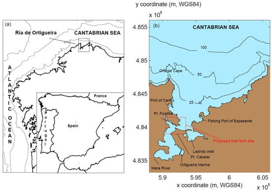 The Ria de Ortigueira (Figure 1) is the westernmost of the Galician Rias Altas (NW Spain) delimited by Cape Ortegal and Pt. Estaca de Bares, presenting a total surface area of 85 km2 and a length of 18 km along its main axis. This coastal area emerges as a promising region for tidal stream energy exploitation thanks to its complex geomorphology, with a number of constrictions, and its relatively high tidal range (maxima of 4.5 m). Previous works [16,45] show that tidal flows of approximately 2.5 ms−1 can be reached in the narrowing between Pt. Postiña and Pt. Cabalar, indicating the suitability of the Ria de Ortigueira as the location for a tidal stream farm.