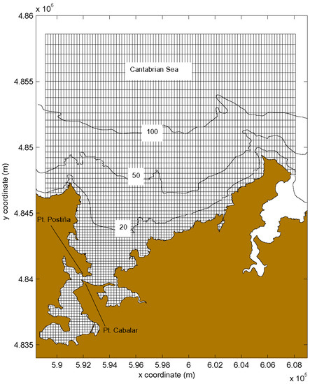The numerical model covers the whole ria by means of a Cartesian grid extending towards the adjacent continental shelf up to the 150 m isobath at a distance of approx. 10 km offshore. This grid (Figure 2) is composed of 57,361 varying-size cells, with the grid size set as follows: in the inner and middle ria, a grid resolution of 50 × 50 m is adopted, progressively decreasing in the y-direction up to 50 × 150 m at the outer ria (northern boundary of the grid). Regarding the vertical discretisation, a σ-coordinate system composed of twelve layers was used [52], with the following layer thicknesses (percentages of water column) from surface to bottom: 2, 3, 5, 10, 15, 15, 15, 15, 10, 5, 3, and 2 [23,40,53].This distribution of σ-layers, which provides a higher grid resolution near the surface and seabed, ensures an adequate modelling of boundary layer flows [53].