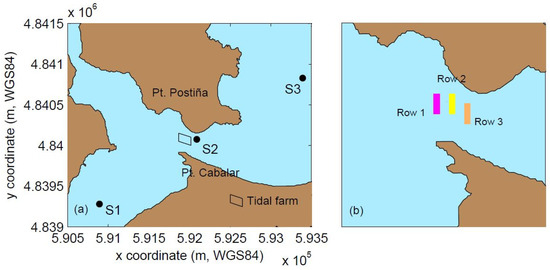 Figure 3 shows the layout of the proposed tidal farms, which are located in the surroundings of the narrowing between Pt. Postiña and Pt. Cabalar, where the strongest tidal currents are found (see Section 1). Both plants have the same layout with a surface area of about 1500 m2. The first plant is composed of floating TSTs occupying the upper part of the water column, and the second plant is composed of TSTs of the same characteristics but fixed to the bottom and occupying the lower part of the water column.