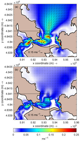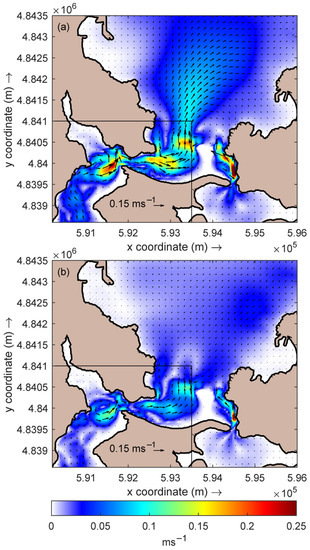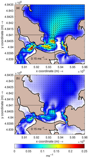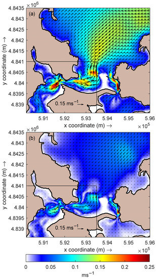 The most usual procedure to compute the residual circulation induced by the tide consists of time-averaging or filtering the transient velocities computed by the numerical model [69]. There are other approaches, such as those based on the numerical solving of the so-called residual velocity evolution equations [70], which are not considered in the present application. The transient Eulerian horizontal velocity vector numerically computed (u, v) is decomposed into its periodic and residual components (up, vp) and (ur, vr), respectively, as follows: