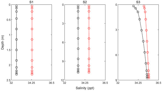 Salinity vertical profiles at S1, S2, and S3 during CS1 (spring–summer season) (red line) and CS2 (autumn–winter season) (black line).