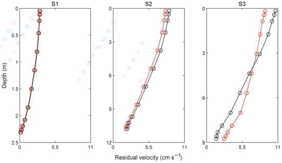 Vertical profiles of the magnitude of the residual circulation at S1, S2, and S3 during CS1 (spring–summer season) (red line) and CS2 (autumn–winter season) (black line).