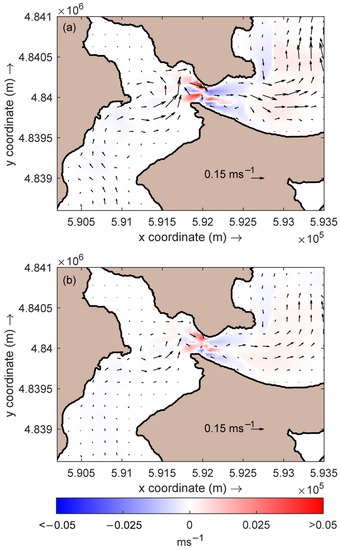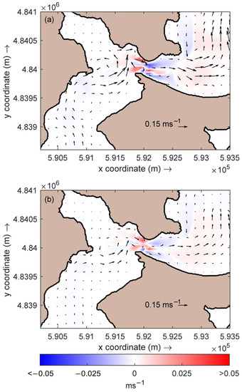 Residual flow pattern in Ria de Ortigueira under case study CS6 conditions (vectors); differences in the residual flow magnitude between altered flow and reference situation (CS6–CS2) (colour map). (a) Surface layer; (b) bottom layer.