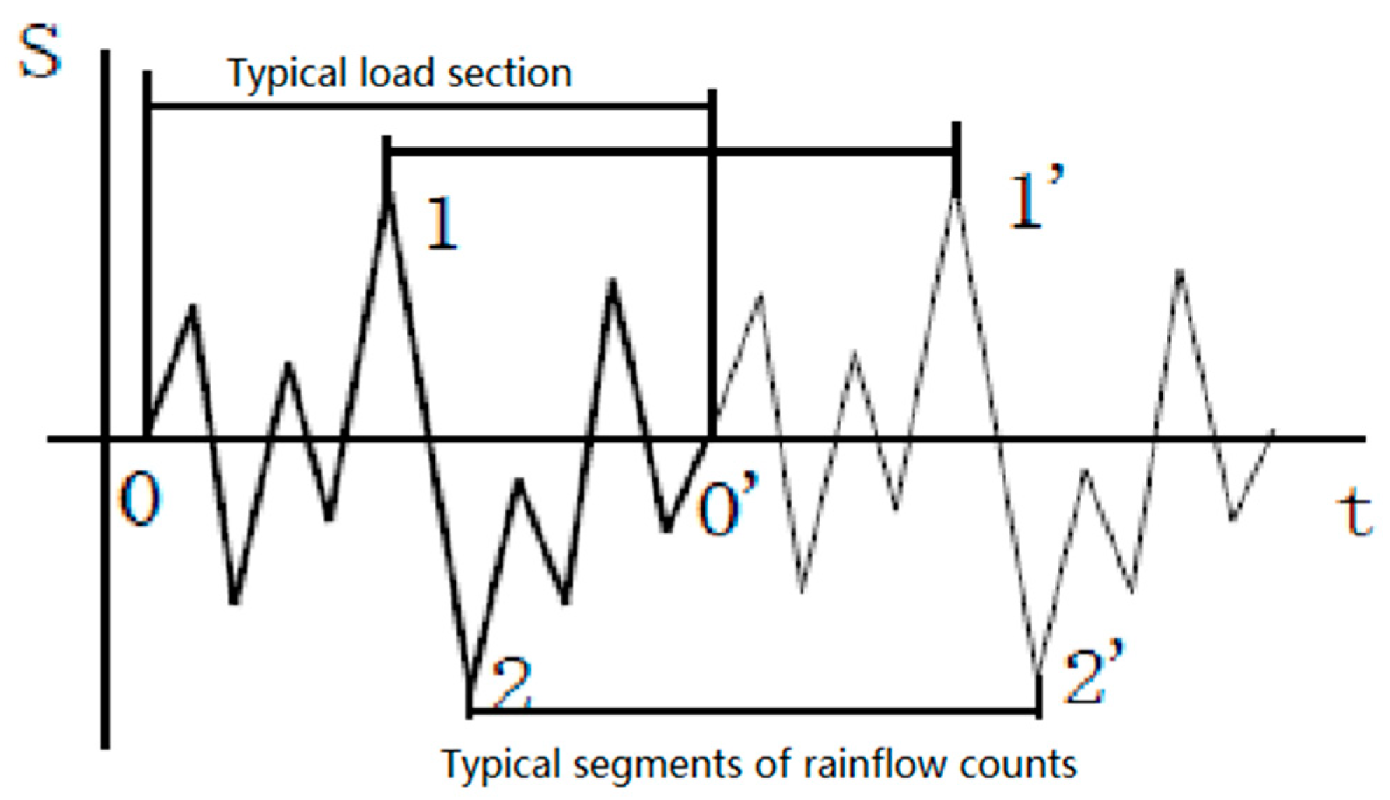 The rain-flow counting method is generally applied to deal with the time-calendar stress variation of structures. The method of transforming an irregular, random time history load into a series of cycles is called “cycle counting”. The simplified rain-flow counting method is suitable for a repeating course based on a typical load spectrum. Since the load is the repetition of a typical segment, taking the start and end of the maximum peak and valley as the typical segment will not cause a loss of generality, as shown in