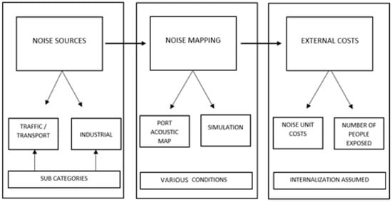 The purpose of this study is threefold: (a) to classify the noise sources in the port originating from two sources, traffic and industrial, (b) to provide an overview of the strategic noise maps, and present theoretical simulation(s) of noise propagation from ships at berth according to the determined propositions, and (c) to calculate the external costs of noise pollution due to the social and environmental damage generated in the subject area. Figure 1 shows the flowchart of the study.